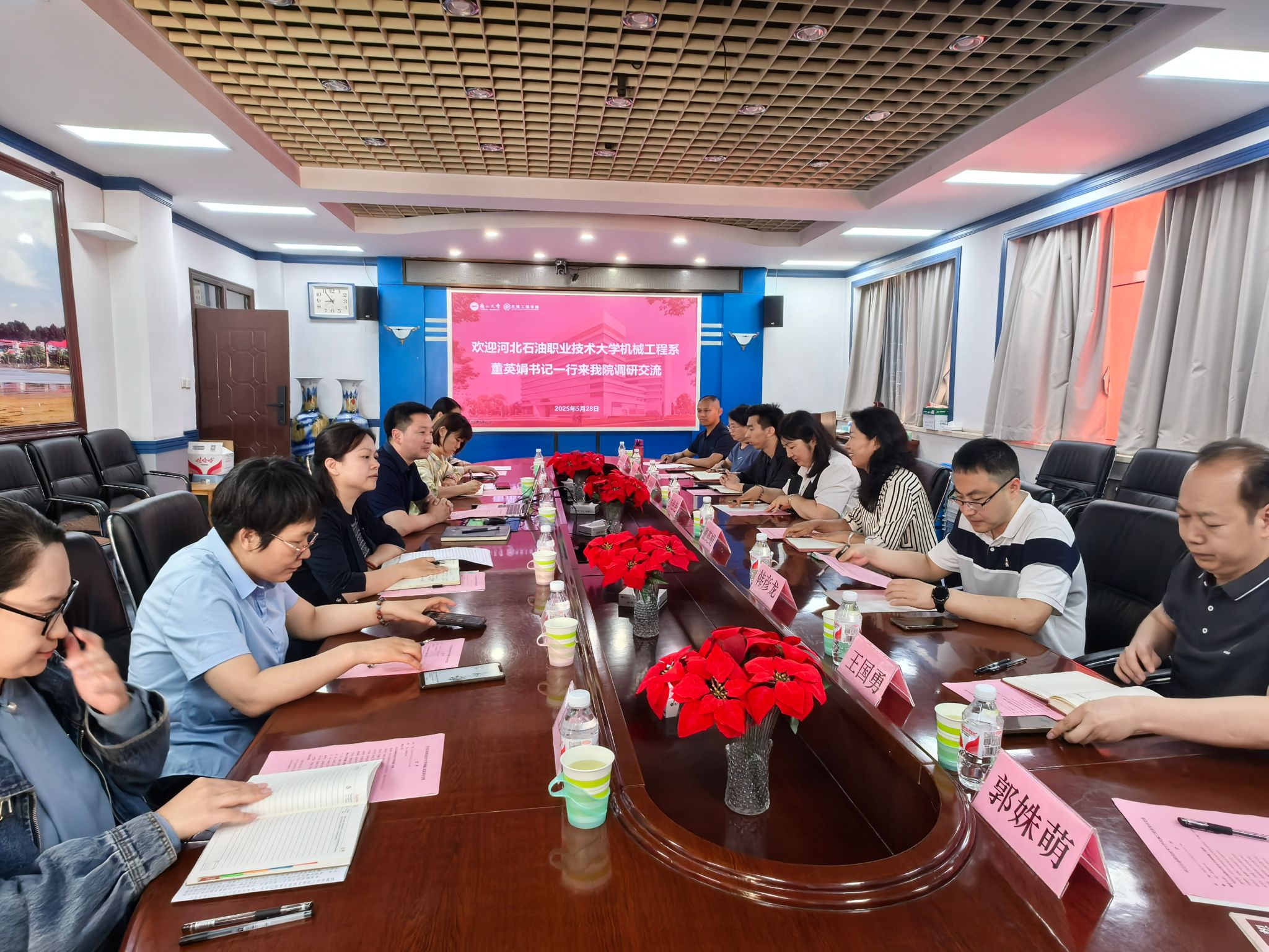 5月28日,河北石油职业技术大学机械工程系党总支书记董英娟一行8人到机械工程学院调研交流。机械工程学院党委书记产佳、副书记韩冰、师生党支部书记代表及相关工作人员参加交流活动。